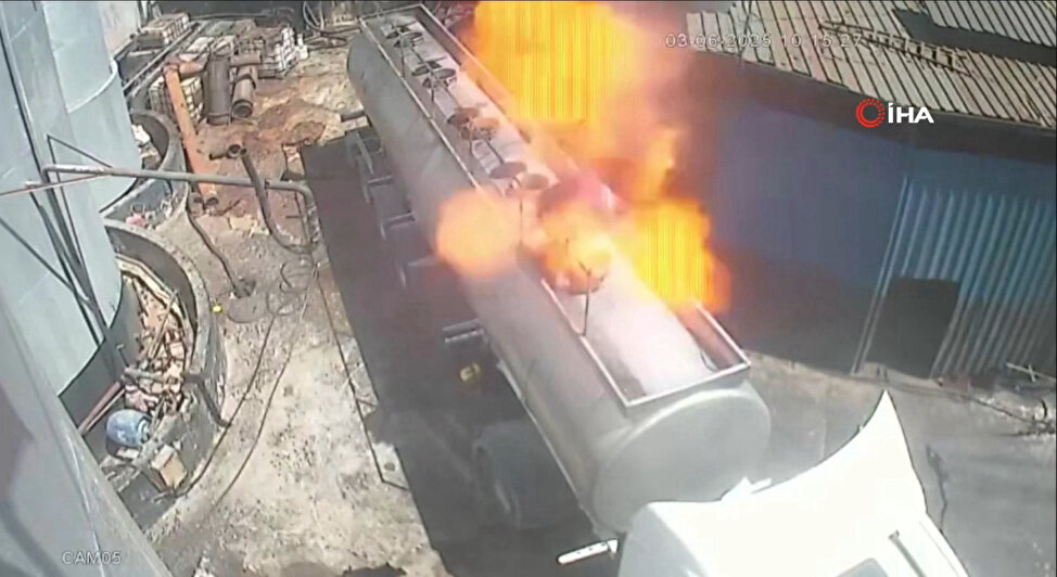 Gaziantep'in Nizip ilçesinde ayçiçek yağı fabrikasında bir işçinin ağzında sigara ile açmaya çalıştığı tanker kapağı bomba gibi patladı. İşçinin metrelerce savrularak ağır yaralandığı patlama anı güvenlik kamerasına yansıdı.