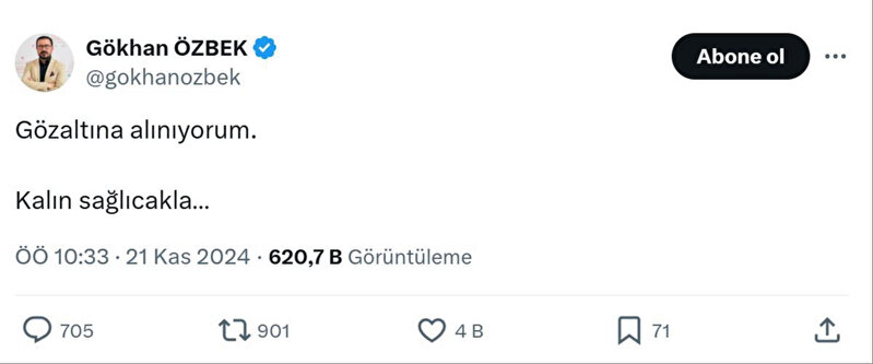 23 Derece adlı yayın platformunun sahibi Gökhan Özbek gözaltına alınmış, sosyal medya hesabı X üzerinden yaptığı paylaşımda, "Gözaltına alınıyorum. Kalın sağlıcakla" ifadelerini kullanmıştı.