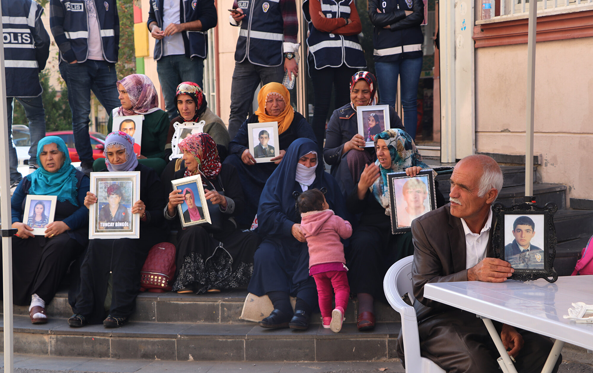 6- Mersin'in Anamur ilçesinde yaşayan Rahime Uymaz, Diyarbakır'ın Lice ilçesinde 28 Temmuz 2015'te eşi ve kızının yanında aracından indirilerek, kaçırılan yeğeni polis memuru Sedat Yabalak (34) için oturma eylemine katıldı. Polis Sedat Yabalak'ın hasta annesi Ünzile Yabalak ise 8 Eylül akşamı Diyarbakır'a gelip nöbete başladı. Solunum hastası Ünzile Yabalak'a, PKK'lı teröristler tarafından 23 Eylül 1995'te şehit edilen Astsubay Murat Namdar'ın eşi Yıldız Namdar refakat ediyor.