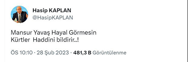 CHP’li Ankara Büyükşehir Belediye Başkanı Mansur Yavaş'ın "Altılı Masa beni aday gösterirse benim için görevdir" açıklamasına HDP'den sert cevap geldi. Sosyal medya hesabından paylaşımda bulunan HDP'li Hasip Kaplan, "Mansur Yavaş hayal görmesin. Kürtler haddini bildirir." dedi.