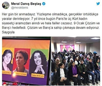 HDP'li Meral Danış Beştaş, TBMM'de yaptığı basın toplantısında Fransa'nın başkenti Paris'te öldürülen PKK'nın kurucularından Sakine Cansız ve örgüt mensupları Fidan Doğan ve Leyla Söylemez'i andı. Beştaş, “Paris'te katledilen Sakine Cansız, Fidan Doğan ve Leyla Söylemez'in anısının önünde saygıyla eğildiğimi ve katillerini ortaya çıkarma mücadelemizden vazgeçmeyeceğimizi ifade etmek istiyorum' dedi.