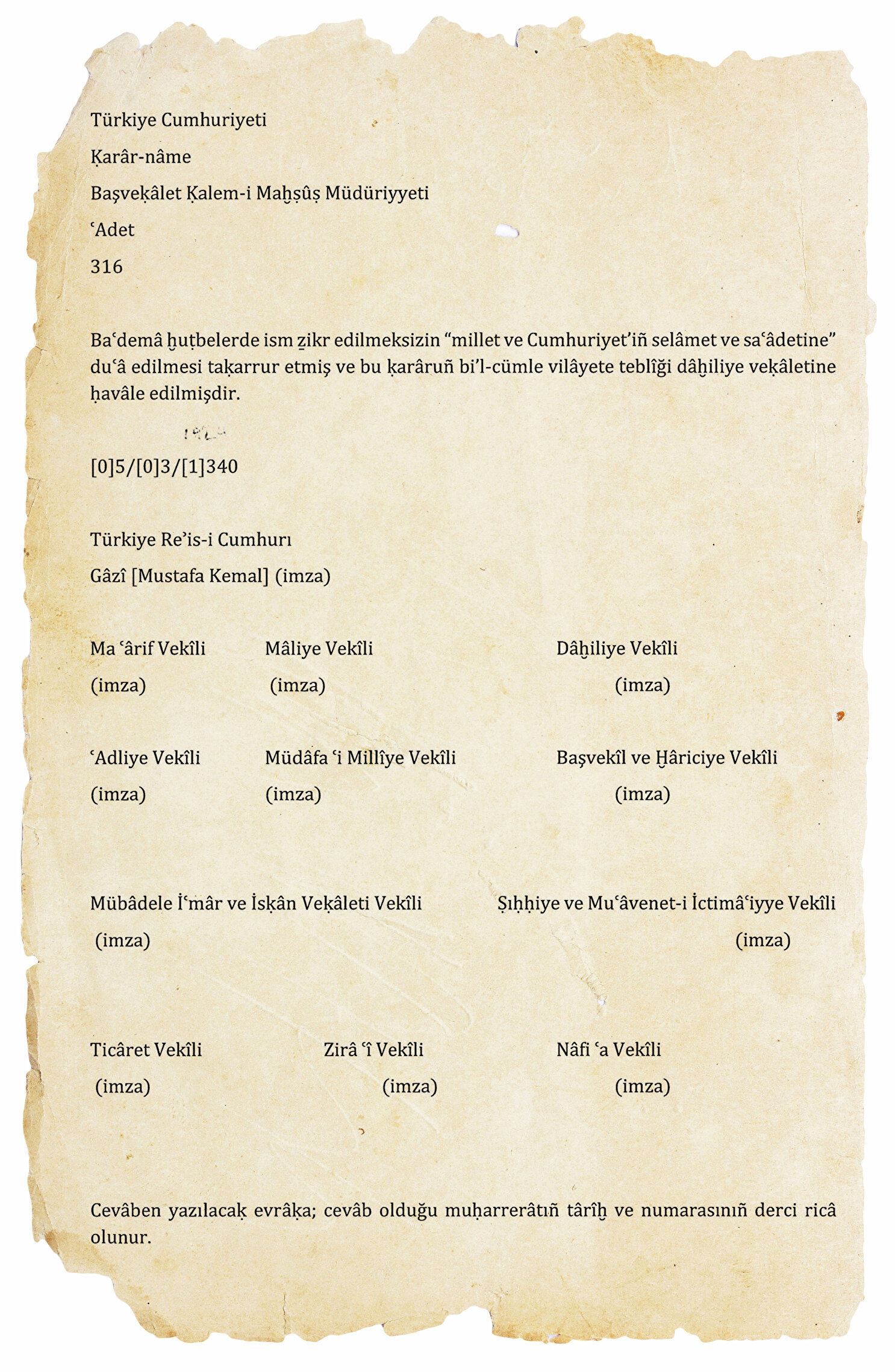 ‘Türkiye Reisi Cumhuru’ olarak bizzat kendi imzasıyla Gazi Mustafa Kemal Paşa tarafından Dahiliye Vekaleti’ne (İçişleri Bakanlığı’na) oradan da ‘Acele’ kayıtlı şifre telgraflarla valiliklere gönderilmiş kararnamede Atatürk, “Bundan sonra hutbelerde isim zikredilmeksizin “millet ve cumhuriyetin saadet ve selametine dua edilmesini” istiyor. Duaların ‘millet ve Cumhuriyet’in selameti için yapılmasına ilişkin isteğin gerekçesine de hilafeti kaldıran yasal düzenlemede rastlanıyor. İlgili yasanın birinci maddesinde “halifeliğin hükümet, Cumhuriyet, yani TBMM’nin anlam ve kavramı içinde zaten saklı olduğu” belirtiliyor.