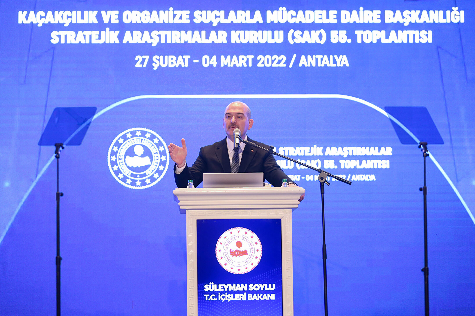 İçişleri Bakanı Süleyman Soylu, Antalya'da düzenlenen Kaçakçılık ve Organize Suçlarla Mücadele Daire Başkanlığı Stratejik Araştırmalar Kurulu 55. Toplantısı'nda açıklamalarda bulundu.