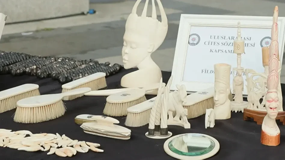 Aynı baskında koruma altındaki türlere ait materyaller kapsamında olan timsah tahniti, sülün tahniti, engerek tahniti, ceylan postu, piton derisi, timsah eli ve trofesi, yaban keçisi kafatası, aslan tırnağı, kurt dişi, timsah dişi, fil dişi ile fildişinden imal edilmiş çeşitli boyutlarda objeler; fildişi, caretta caretta, geyik boynuzu, balina dişi ve bufalo boynuzundan imal edilmiş tespihlerden oluşan toplam 6 bin 206 obje de ele geçirildi.