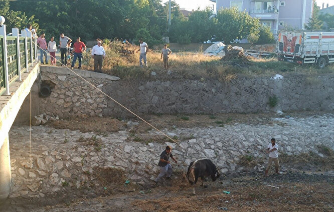 Kurbanlığı yakalamak için sahipleri, belediye ekipleri ve vatandaşlar seferber oldu. Ortalığı bir birine katarak kaçan kurbanlık yaklaşık 3 saatin sonunda sahipleri tarafından girdiği su akışı olmayan Gali Çayında iple yakalandı.