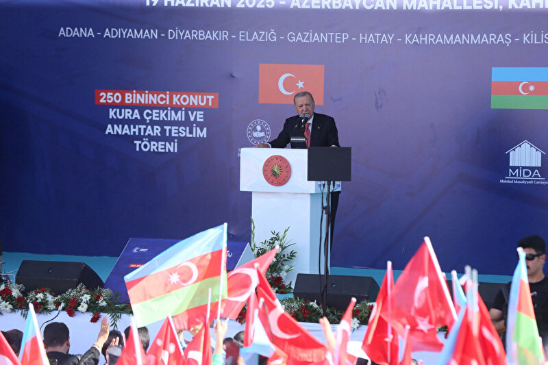 Deprem bölgesinde inşa edilen 250 bininci afet konutu, Cumhurbaşkanı Recep Tayyip Erdoğan ve Azerbaycan Cumhurbaşkanı İlham Aliyev’in katıldığı törenle hak sahibine teslim edildi. Kahramanmaraş’taki Azerbaycan Mahallesi’nde düzenlenen törende konuşan Erdoğan, “Biz iki devleti, tek yürek taşıyan kardeşleriz” dedi. Erdoğan, Azerbaycan’ın desteğiyle yapılan konutları hatırlatarak, “Bu dayanışmayı asla unutmayacağız” ifadelerini kullandı.