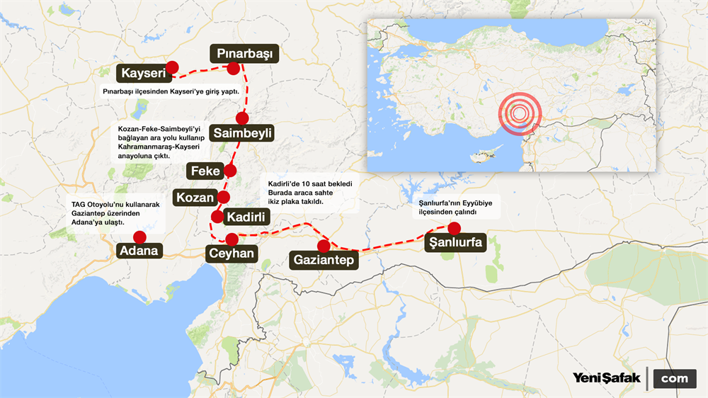Sahte plakalı ve bomba düzeneği yüklenmiş olarak bu kez ara yollardan Kayseri'ye geçen bomba düzeneği yüklü aracın, Kozan-Feke-Saimbeyli'yi bağlayan ara yolu kullanıp Kahramanmaraş-Kayseri anayoluna çıktığı ve Pınarbaşı ilçesinden kente giriş yaptığı anlaşıldı.