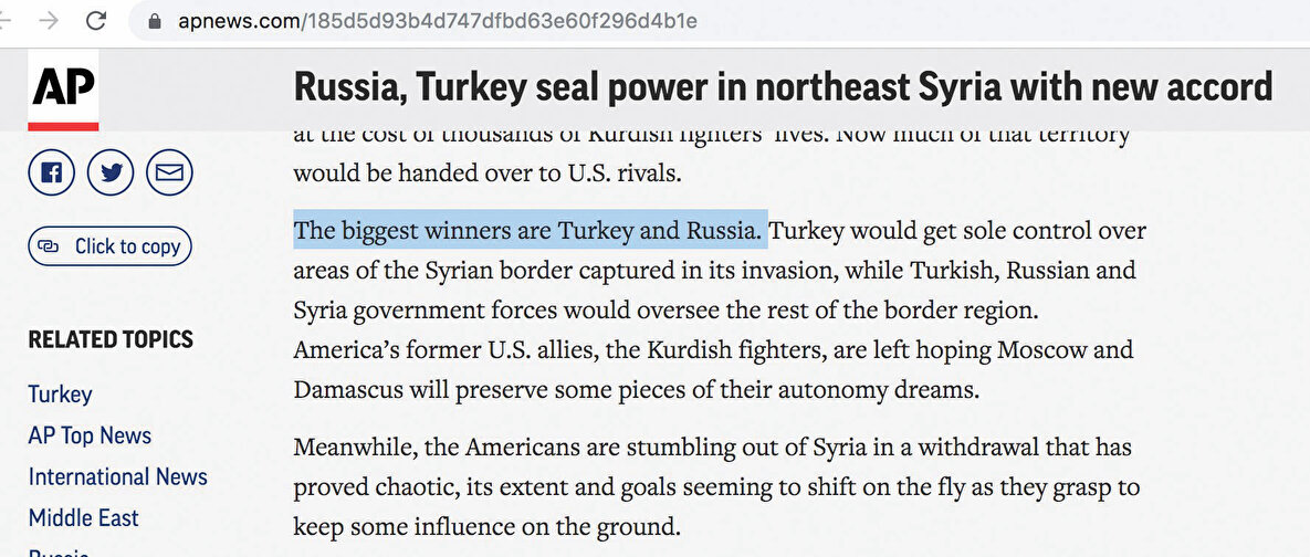 Amerika merkezli bir başka haber ajansı Associated Press (AP) ise Suriye’de en büyük kazanan Türkiye ve Rusya yorumuyla gelişmeyi son dakika haberi olarak dünyaya duyurdu. AP haberinde, Soçi’deki mutabakatın, ABD Başkanı’nın iki hafta önce asker çekme kararı sonrasında, Suriye haritasında dramatik bir değişime neden olduğunu savundu. Ajans, “En büyük kazananlar Türkiye ve Rusya. Türkiye operasyonla elde ettiği alanlarda tek söz sahibi olacak, öte yandan sınırın geri kalanını ise Türkiye, Rusya ve Esad güçleri gözetleyecek” değerlendirmesini yaptı.