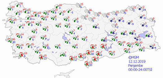 Yurdun Marmara, Ege, Akdeniz, İç Anadolu, Batı Karadeniz, Doğu ve Güneydoğu Anadolu ile Çorum, Gümüşhane ve Bayburt çevrelerinin sağanak, Akdeniz kıyılarının yer yer gök gürültülü sağanak, İç Anadolu’nun doğusu, Doğu Anadolu’nun kuzey ve doğusu ile Bolu, Kastamonu, Kütahya, Afyonkarahisar’ın kuzeyi, Konya’nın güneyi ve Akdeniz’in iç kesimlerinin karla karışık yağmur ve yükseklerinin yer yer kar yağışlı geçeceği tahmin ediliyor. Yağışların Adana, Mersin, Osmaniye, Kahramanmaraş, Hatay, Gaziantep, Kilis, Adıyaman, Isparta’nın güneyi ve Burdur’un doğusunda kuvvetli (21-50 kg/m2), Antalya çevrelerinde çok kuvvetli ve yer yer şiddetli (51-100 kg/m2) olması bekleniyor. Bu sabah saatlerinde doğu kesimlerinde buzlanma ve don olayı ile birlikte yer yer pus ve sis hadisesi bekleniyor.