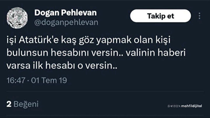 Başörtülü bir kadının verdiği röportaj üzerine attığı tweet ise okunamayacak cinsten iğrençlikte. Peygamberi karikatürize ettiğimi inkar etse de provokasyon amacı belli olan Pehlevan, Atatürk'ü hedef alan karikatürlere ise bir hayli sert çıkmıştı.