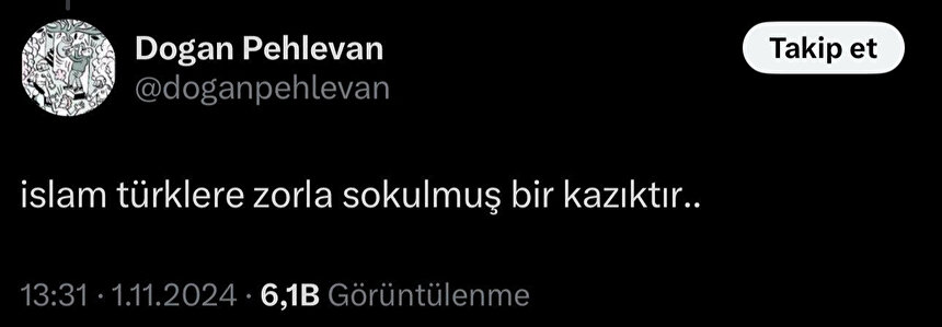 Alçak karikatürü çizen Doğan Pehlivan'ın Geçmişte de benzer provokasyonlara giriştiği ortaya çıktı. Geçtiğimiz yılın kasım ayının hemen başında yaptığı X paylaşımında, "İslam Türklere zorla sokulmuş bir kazıktır…" ifadelerini kullanmış. Doğan Pehlevan isimli sözde karikatürist, Leman dergisinin son sayısında skandal bir çizim yaptı. Peygamberimiz Hz. Muhammed'i (sav) ile Hz. Musa'yı resmeden Pehlevan'ın geçmişte de İslam'a hakaret ettiği ortaya çıktı.