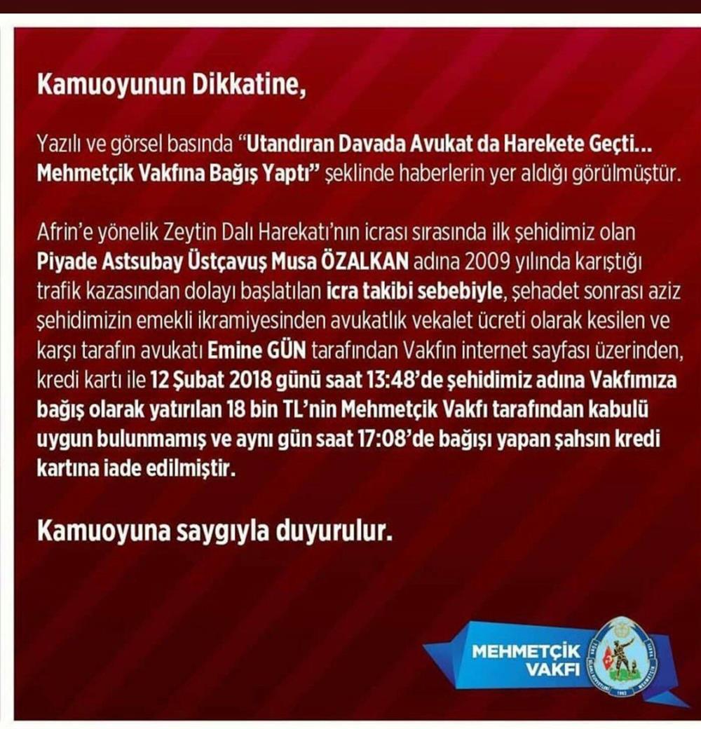 - Bunun üzerine Mehmetçik Vakfı, avukatın ödediği bağışı geri iade ettiğini belirtti. Mehmetçik Vakfı yaptığı açıklamada " Kamuoyunun dikaktine, yazılı ve görsel basında "Utandıran Davada Avukat da Harekete Geçti... Mehmetçik Vakfına Bağış yaptı" şeklinde haberlerin yer aldığı görülmüştür. Afrin'e yönelik Zeytin Dalı Harekatı'nın icrası sırasında ilk şehidimiz olan Piyade Astsuba Üstçavuş Musa Özalkan adına 2009 yılında karıştığı trafik kazasından dolayı başlatılan icra takibi sebebiyle, şehadet sonrası aziz şehidimizin emekli ikramiyesinden avukatlık vekalet ücreti olarak kesilen ve karşı tarafın avukatı Emine Gün tarafından Vakfın internet sayfası üzerinden, kredi kartı ile 12 Şubat 2018 günü saat 13:48'de şehidimiz adına Vakfımıza bağış olarak yatırılan 18 bin TL'nin Mehmetçik Vakfı tarafından kabulü uygun bulunmamış ve aynı gün saat 17:08'de bağışı yapan şahsın kredi kartına iade edilmiştir. Kamuoyuna saygıyla duyurulur" ifadelerini kullandı.