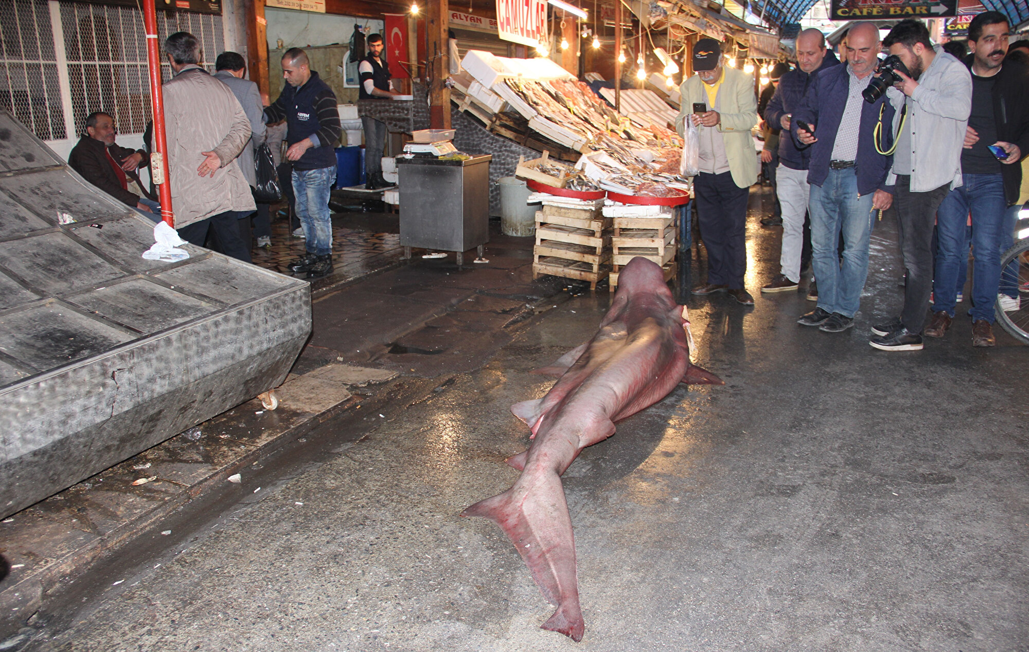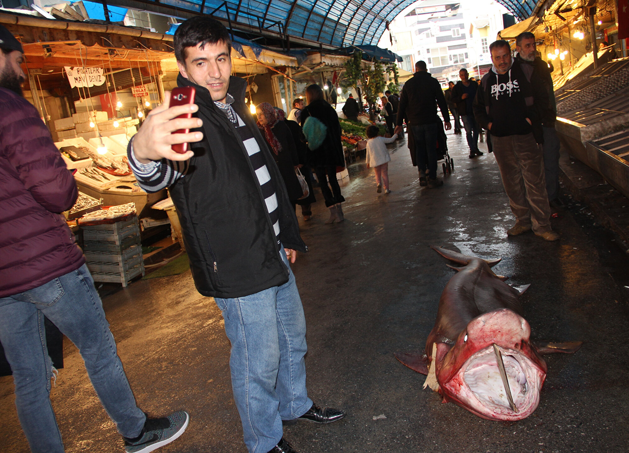 Balıkçıların 3 saatlik uğraşı sonucunda yakalanan köpekbalığı, Mersin Balık Pazarı'nda sergilendi. Pazara gelen vatandaşlar, ilgiyle dev köpekbalığını izlerken, kimileri dokundu kimileri de cep telefonlarıyla fotoğraf çektirip öz çekim yaptı.