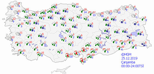 Meteoroloji son hava durumu tahminlerine göre, Marmara'nın doğusu, Ege (İzmir hariç), Akdeniz, İç Anadolu, Batı Karadeniz, Doğu Anadolu'nun güneydoğusu ve Güneydoğu Anadolu ile Kırklareli, Tekirdağ, Balıkesir, Samsun, Amasya, Çorum, Tokat, Malatya, Elazığ, Erzincan, Tunceli, Ağrı, Erzurum ve Siirt çevrelerinin yağışlı geçeceği tahmin ediliyor. Yağışların, Akdeniz kıyılarında yer yer gök gürültülü sağanak, İç Anadolu'nun doğusu, Batı Karadeniz’in iç kesimleri ve Doğu Anadolu ile Bilecik, Kütahya, Konya, Karaman, Eskişehir ve Afyonkarahisar çevreleri ile Akdeniz’in iç kesimlerinin yükseklerinde karla karışık yağmur ve yer yer kar şeklinde olması bekleniyor. Yağışların, Doğu Akdeniz ile Düzce, Zonguldak, Bartın, Gaziantep, Kilis ve Adıyaman çevrelerinde kuvvetli ve yer yer şiddetli olması bekleniyor.