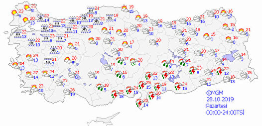 Meteoroloji Genel Müdürlüğü tarafından yapılan son değerlendirmelere göre; yurdun güney ve doğu kesimlerinin parçalı yer yer çok bulutlu, Orta ve Doğu Akdeniz, Doğu Anadolu’nun güneybatısı, Güneydoğu Anadolu’nun batısı, Karaman, Kayseri, Niğde, Aksaray, Nevşehir, Konya’nın güney çevreleri, Antalya’nın doğu kesimleri ile gece saatlerinden itibaren Bitlis, Şırnak, Mardin, Batman ve Siirt çevrelerinin yerel olmak üzere sağanak ve gök gürültülü sağanak yağışlı, diğer yerlerin parçalı ve az bulutlu geçeceği tahmin ediliyor. Bu sabah saatlerinde Marmara, İç Ege, İç Anadolu’nun kuzeybatısı ile Batı Karadeniz’in iç kesimlerinde yer yer pus ve sis hadisesi bekleniyor.