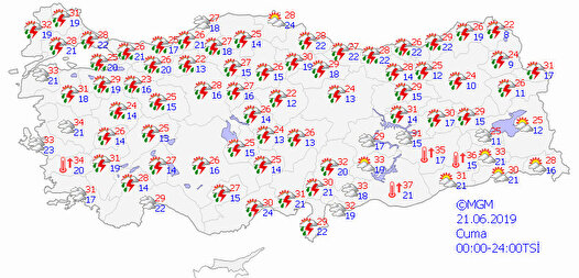 Meteoroloji Genel Müdürlüğü tarafından yapılan son hava durumu değerlendirmelere göre, ülke genelinin parçalı ve çok bulutlu, Marmara (Çanakkale’nin güneyi hariç), İç Ege, Batı Akdeniz’in iç kesimleri, Doğu Akdeniz, İç Anadolu, Karadeniz, Doğu Anadolu'nun kuzeyinin sağanak ve gök gürültülü sağanak yağışlı geçeceği tahmin ediliyor. Yağışların; Sakarya, Düzce ve Zonguldak çevrelerinde kuvvetli; Artvin, Rize, Trabzon, Giresun ve Ordu çevreleri ile Samsun’un doğu ilçelerinde kuvvetli ve yer yer çok kuvvetli olması bekleniyor.