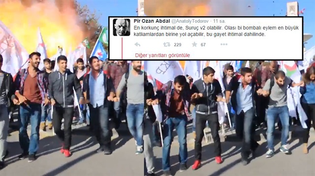 Ankara'da çok sayıda kişinin hayatını kaybettiği korkunç saldırıya ilişkin dün geceden twitter'da yazılan çarpıcı bilgiler oraya çıktı. Twitter'da Pir Ozan Aptal (@AnotolyTodorov) isimli PKK yanlısı paylaşımlar yapılan hesaptan, “En korkunç ihtimal de, Suruç v2 olabilir. Olası bi bombalı eylem en büyük katliamlardan birine yol açabilir, bu gayet ihtimal dahilinde. Mitingin yasal olması katliamın siyasi çıkara dönüşmesine vesile olur, bu durum bile böyle bi saldırının ihtimalini arttırıyor" şeklinde öngörüler paylaşıldı.