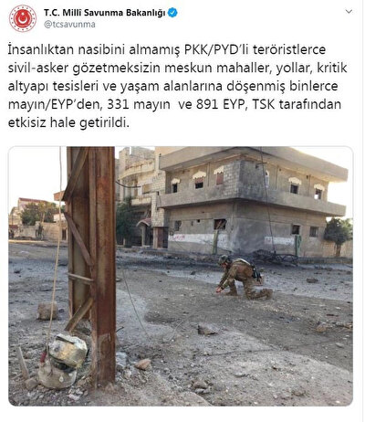 Milli Savunma Bakanlığı, PKK/PYD'li teröristlerce meskun mahaller, yollar, kritik altyapı tesisleri ve yaşam alanlarına döşenen 331 mayın ve 891 el yapımı patlayıcının etkisiz hale getirildiğini açıkladı.