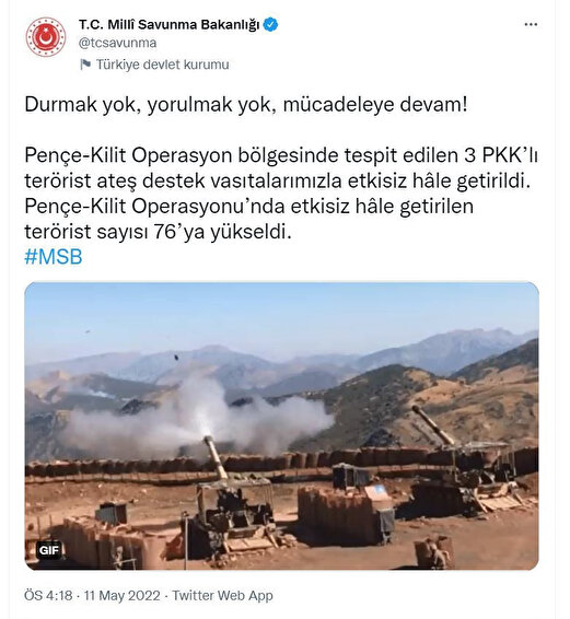 MSB; Pençe-Kilit Operasyon bölgesinde tespit edilen 3 PKK’lı teröristin ateş destek vasıtalarımızla etkisiz hale getirildiğini açıkladı. Pençe-Kilit Operasyonu’nda etkisiz hale getirilen terörist sayısı 76’ya yükseldi.