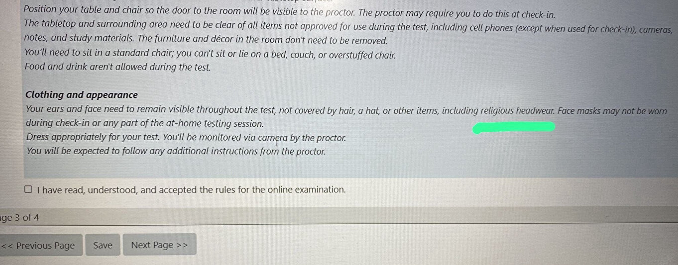 “Kulaklarınız ve yüzünüz sınav boyunca şapka, herhangi başka bir şey veya başörtüsü ile örtülmeyecek şekilde görünür olması gerekmektedir”