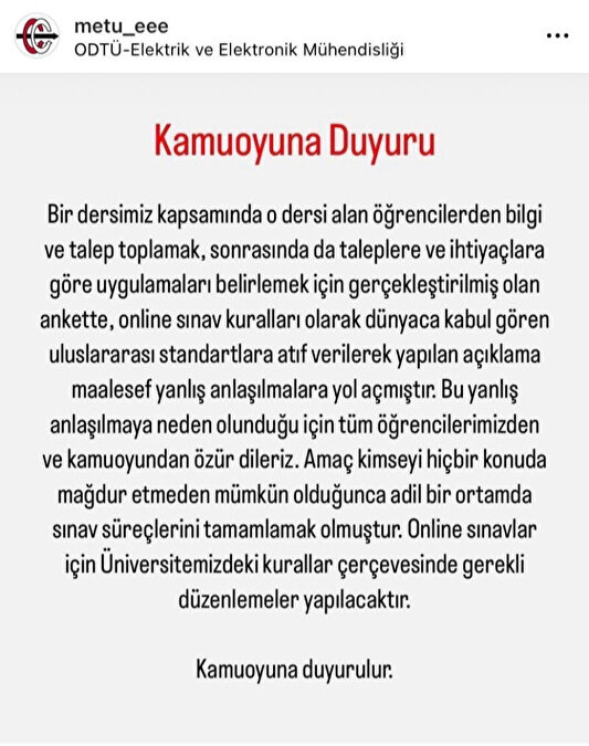 "Bir dersimiz kapsamında o dersi alan öğrencilerden bilgi ve talep toplamak, sonrasında da taleplere ve ihtiyaçlara göre uygulamaları belirlemek için gerçekleştirilmiş olan ankette, online sınav kuralları olarak dünyaca kabul gören uluslararası standartlara atıf verilerek yapılan açıklama maalesef yanlış anlaşılmalara yol açmıştır. Bu yanlış anlaşılmaya neden olunduğu için tüm öğrencilerimizden ve kamuoyundan özür dileriz. Amaç kimseyi hiçbir konuda mağdur etmeden mümkün olduğunca adil bir ortamda sınav süreçlerini tamamlamak olmuştur. Online sınavlar için üniversitemizdeki kurallar çerçevesinde gerekli düzenlemeler yapılacaktır"