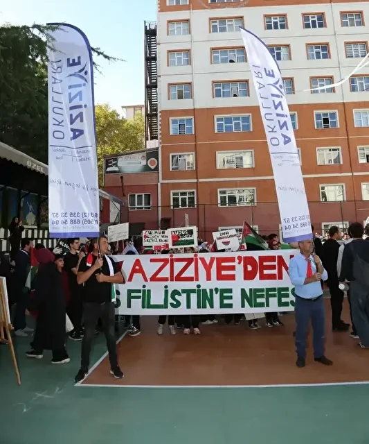 Aziziye Okulları Genel Müdürü Fatmanur Günaydın Çakır, “Filistin halkı yalnız değildir. Bizler, Aziziye ailesi olarak adaletin, merhametin ve insanlığın sesi olmaya devam edeceğiz. Bu yürüyüş bir dayanışma çağrısı değil, bir vicdan borcudur” dedi.