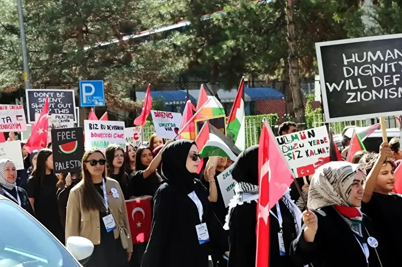 Öğreciler dersimiz her zaman Gazze diyerek slogan attı. Filistin bayrakları ve barış temalı dövizlerle yürüyüş boyunca birlik, vicdan ve dayanışma mesajları verildi.