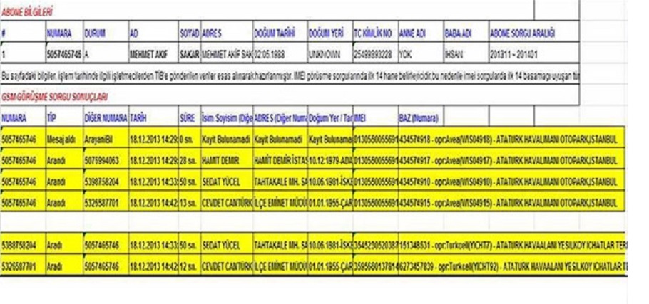 M.A.S'nin kullandığı 505 746... numaralı telefon hattının incelenen HTS raporlarında; 18/12/2013 günü saat: 14.29-14:33-14:42 sıralarında Atatürk Havalimanı Baz bölgesinde telefonunun sinyal verdiği, saat 14:33 sıralarında S.Y adına kayıtlı 539 875... numaralı hat ile, saat: 14.42 sıralarında C. C adına kayıtlı 532 658... numaralı hattı ile irtibat kurduğu, bu şahısların da kendisi gibi Atatürk Havalimanı'nda bulundukları, M.A.S.'nin olay günü irtibat kurduğu şahıslarla bu görüşmeler haricinde başkaca bir irtibatının bulunmadığı tespit edildi.