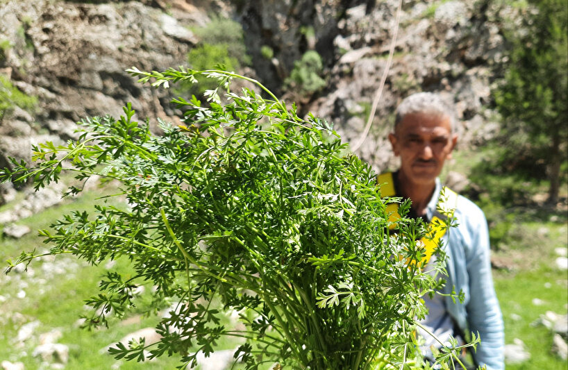 Bu yıl da sezonu tamamlamak üzere olduklarını anlatan Ertekin, "Kişniş toplamak için uluslararası sertifikalı dağcılık malzemeleri kullanıyorum. Güvenlik amacıyla her türlü ekipmanım var. Bu 'çıkılamaz' denilen yamaçlardaki kişnişleri topluyoruz. Bu yerler tehlikeli yerler olduğu için herkes çıkıp inemez." diye konuştu.