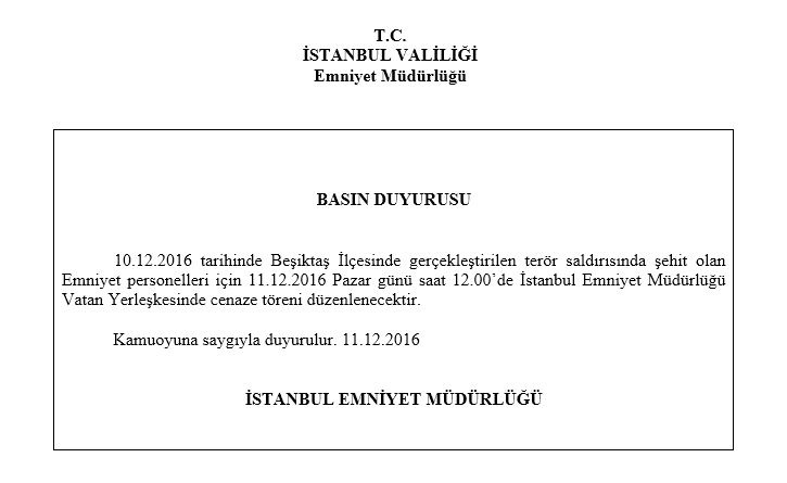 İstanbul Emniyet Müdürü Dr. Mustafa Çalışkan, törende yaptığı konuşmada, "Bildiğiniz gibi Beşiktaş ilçesinde terörist eylem sonucu 38 şehidimiz var. Çok sayıda vatandaşımız yaralandı. Bu ve bunun gibi alçak terör saldırıları asayişi bozmak, yurtiçi ve yurtdışındaki huzuru bozmak, mücadeleyi başarıyla devam ettiren emniyet mensuplarını yıldırmak için yapılıyor. Ciğerimizi yakan bu saldırıya rağmen dimdik ayakta duracağız. Sizler kimlerin köpeğisiniz onu söyleyin. Tüm terör örgütlerine sesleniyorum, vermek istediğiniz adi mesaj anlaşılıyor. Bu saldırıyla ilgili olanlar en kısa zamanda yakalanarak cezaları verilecek. Aziz şehitlerimize karşı en önemli vazifemiz çok çalışmak. Onlar bizim için emanettir. Şehitlerimize Allah'tan rahmet diliyorum. Milletimizin başı sağolsun, vatan sağolsun" dedi.