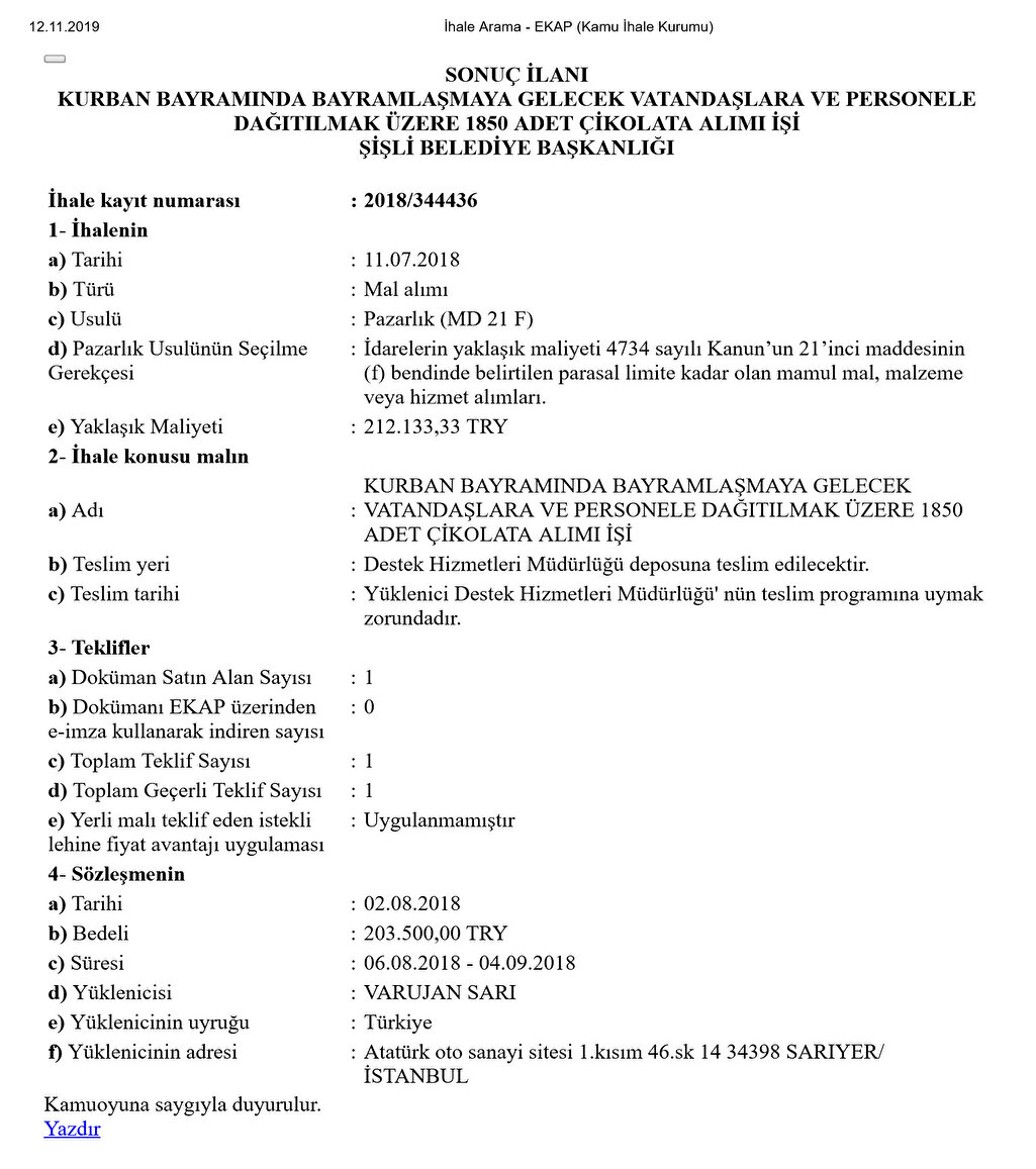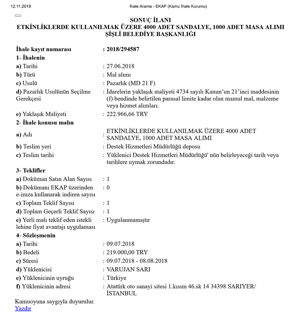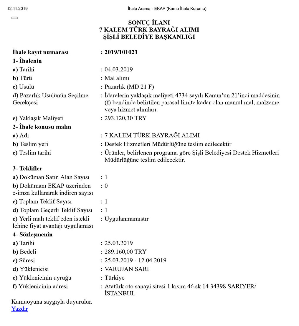 Varujan Sarı isimli şahsa ait şirkete 7 kalem Türk bayrağı alım işi 289.160,00 TL karşılığında verildi. Tek teklif ve tek katılanın olduğu o ihale kapsamında, hemen sözleşme imzalandı.