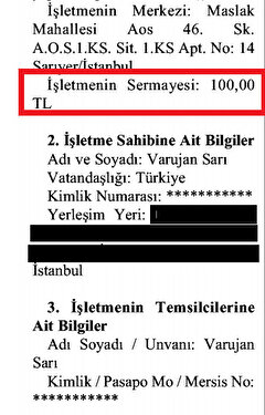 Şirket adresi olarak Maslak Atatürk Oto Sanayi Sitesi'nde bir egzoz dükkanının gösterildiği o şirket, ticaret sicil kayıtlarına göre yalnızca 100 TL sermayeye sahip.