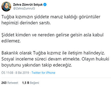 Bakan Zehra Zümrüt Selçuk olaya ilişkin yaptığı açıklamada “Tuğba kızımızın şiddete maruz kaldığı görüntüler hepimizi derinden sarstı. Şiddet kimden ve nereden gelirse gelsin asla kabul edilemez. Bakanlık olarak Tuğba kızımız ile iletişim halindeyiz. Sosyal inceleme süreci devam etmekte. Olayın hukuki boyutunu yakından takip edeceğiz.” ifadelerini kullandı.