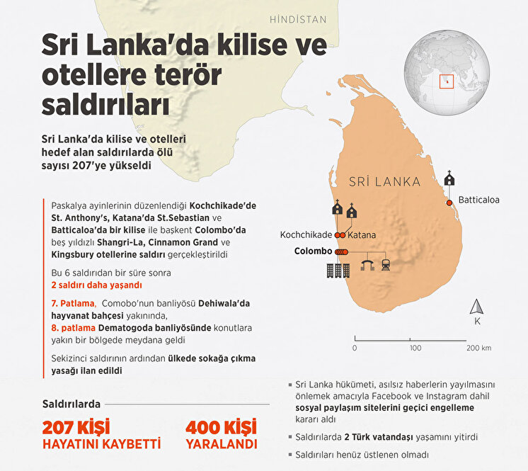 Sri Lanka'da gerçekleşen eş zamanlı 8 patlamalada ilk belirlemelere göre 185 kişi öldü, 400'den fazla kişi yaralandı. Yerel güvenlik kaynakları olayın intihar saldırısı olma ihtimalinin oldukça yüksek olduğunu belirtti.