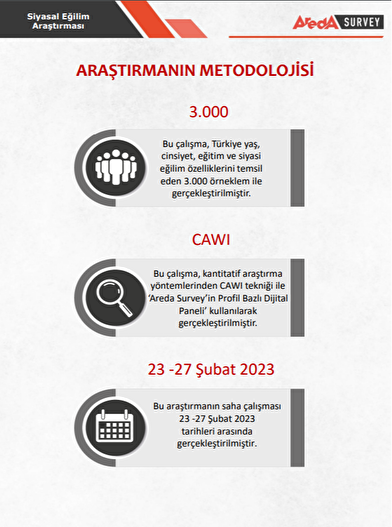 Araştırma şirketi Areda Survey şubat ayı seçim anketini yayınladı. 23-27 Şubat 2023 tarihleri arasında yapılan ankete toplam 3 bin kişi katıldı. Vatandaşlara “Bu pazar cumhurbaşkanlığı seçimi olsa hangi adaya oy verirdiniz?” ve “Bu pazar bir genel seçim olsa hangi partiye oy verirsiniz?” soruları yöneltildi.