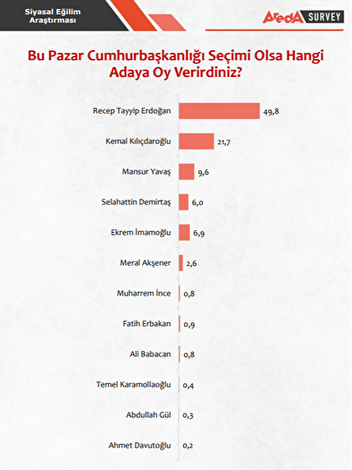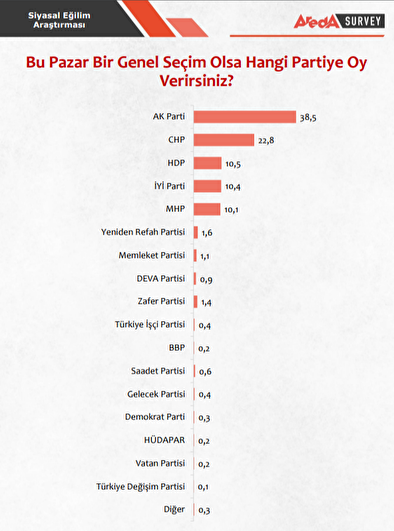 Araştırma şirketi Areda Survey, vatandaşlara “Bu pazar cumhurbaşkanlığı seçimi olsa hangi adaya oy verirdiniz?” ve “Bu pazar bir genel seçim olsa hangi partiye oy verirsiniz?” sorularını yöneltti. Anket sonucuna göre vatandaşların parti tercihi yüzde 38,5 ile AK Parti olurken, cumhurbaşkanı adayları ise yüzde 49,8 ile açık ara Recep Tayyip Erdoğan oldu.