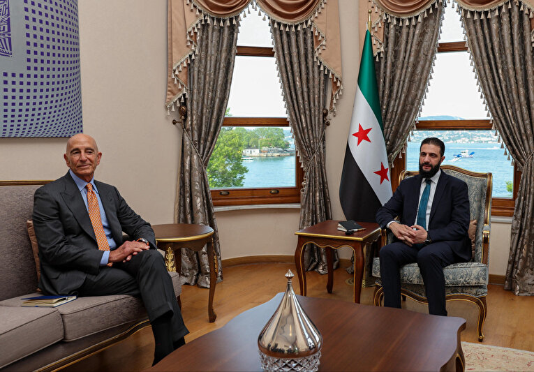 Suriye Cumhurbaşkanı Ahmed Şara, ABD'nin Ankara Büyükelçisi ve Suriye Özel Temsilcisi Thomas Barrack'ı İstanbul'da kabul etti. "Cumhurbaşkanı Şara, ABD'nin yaptırımların kaldırılması konusunda hızla harekete geçmesinden övgüyle söz etti." diyen Barrack, "Suriye tarafı ve ben, bu önemli görüşmeleri sürdürme ve Türkiye, Körfez, Avrupa ve ABD gibi bölgesel ve küresel ortakların yatırımları da dahil olmak üzere, ekonomiyi yeniden inşa etmek üzere Suriye'de özel sektör yatırımlarını geliştirmek için birlikte çalışma kararlılığımızı teyit ettik." ifadelerini kullandı.