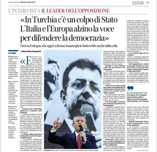 Ekrem İmamoğlu'nun yolsuzluktan tutuklanması sonrası her fırsatta yabancı basına Türk yargısını şikayet eden CHP lideri Özgür Özel, bu kez de Cumhurbaşkanı Erdoğan'ın İtalya ziyareti öncesinde, Corriere Della Sera gazetesine açıklamalarda bulunup şikayet etti.