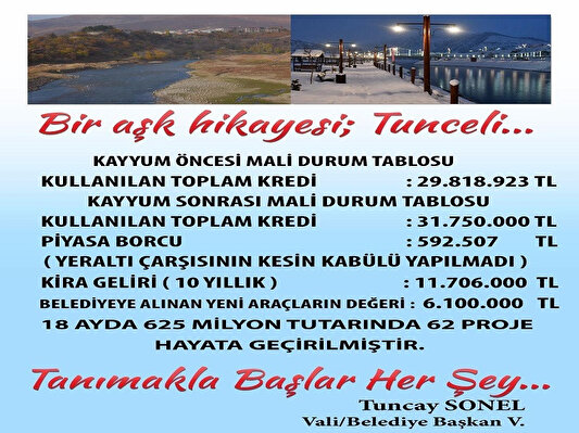 Tunceli Valisi Tuncay Sonel, yeni Belediye Başkanı TKP'li Fatih Mehmet Maçoğlu'nun belediyenin borçları konusundaki sözleriyle ilgili yazılı açıklama yaptı. Vali Tuncay Sonel, "Kendisini tehdit eden Kandil ile uzlaşma çabasını kayyum dönemine çamur atarak sağlamaya çalışmaktadır. Biz teröre hizmet eden bir belediye devraldık. Kayyum öncesi belediyenin tüm kaynaklarının şehirde yaşayanlara değil teröre gittiği ortada iken, kaynaklar yöre insanımızın huzurlu bir kentte yaşamaları için kullanılmıştır" açıklamasında bulundu.