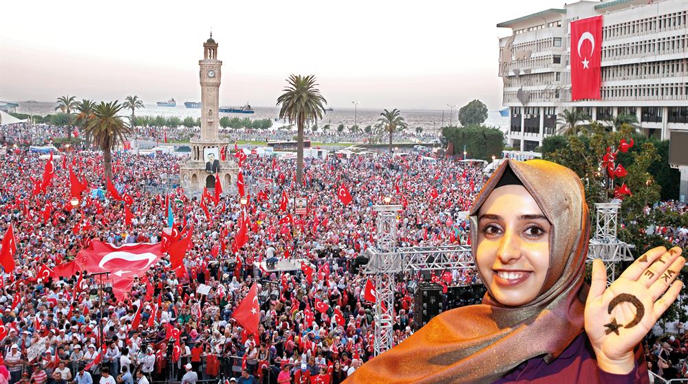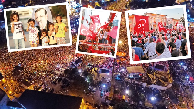 İzmir'de Konak Meydanı'nda toplanan yüzbinler, Türk bayraklarıyla FETÖ aleyhine sloganlar attı. Cumhurbaşkanı Recep Tayyip Erdoğan'a sevgi gösterisinde bulunan vatandaşlar, çalınan “Türkiyem" şarkısını hep bir ağızdan okudu, “Hepimiz Ömer Halisdemir'iz" yazılı pankartlar taşıdı. Burada konuşan Ulaştırma, Denizcilik ve Haberleşme Bakanı Ahmet Arslan, meydanlara çıkanların 23 gündür iradesine sahip çıktığını, 81 ilde iç ve dış düşmanlara dersini verdiğini söyledi.