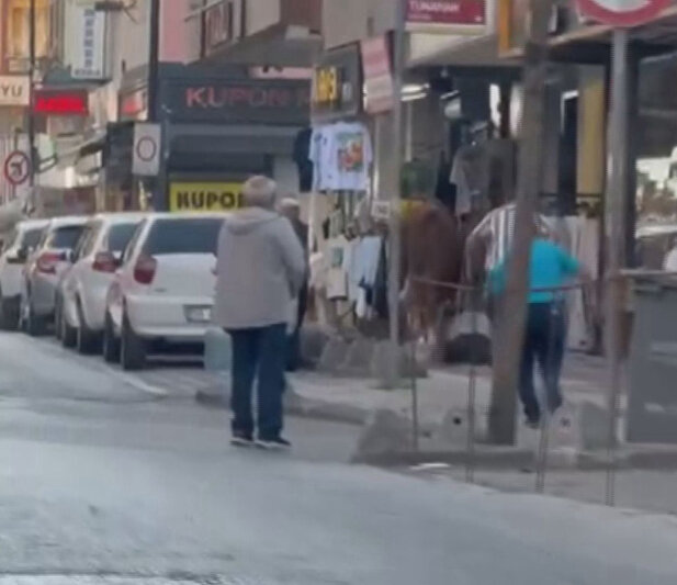 Sokak üzerinde koşarak kaçmaya çalışan boğanın ipini tutmak isteyen sahibi, kaldırımda bir süre sürüklendi. Sahiplerinin uzun süre peşinden koştuğu boğa, çevredekilerin yardımıyla yakalanarak kurban pazarına geri götürüldü. Boğanın kaçtığı anlar cep telefonu kamerası ile kaydedildi.