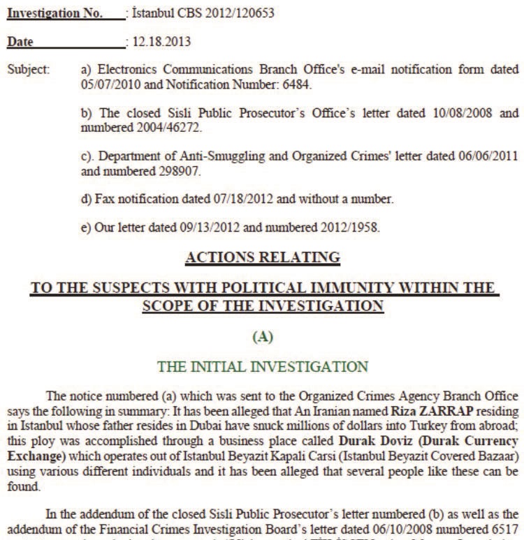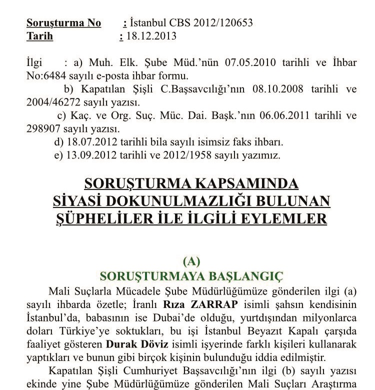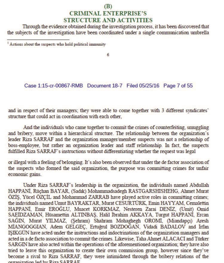 İstanbul Cumhuriyet Başsavcılığı’nın takipsizlik kararı vermesiyle FETÖ’cü polislerin “usule uygun deliller toplamadığı” 17 Aralık fezlekesinin hiçbir hukuki niteliği de kalmadı. Ancak Savcı Bharara tarafından delil olarak kabul edilen fezleke, Zarrab iddianamesine konuldu. Bharara, İngilizce’ye çevrilen fezlekede, değişiklik bile yapmadı. Öyle ki, yazı karakterleri, başlıklar ve renkler bile aynı. Fezlekede, vurgulanmak istenen ve kalın olarak yazılan isimler, iddianamede aynı şekilde kalın olarak yer alıyor. Yine fezlekede “italik” yazı karakteriyle yer alan cümleler de iddianameye aynı şekilde girmiş. İddianamedeki renkli cümleler de dikkat çekiyor. Fezleke içerisinde kırmızı, mavi ve yeşil renklerde olan cümle ve başlıklar da iddianamede aynı şekilde belirtilmiş. Hatta fezlekedeki dipnotların bile iddianameye girdiği görüldü.