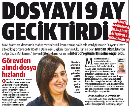 HSYK 1. Daire eski Başkanı İbrahim Okur'un eşi olan Nurdan Okur'un, İstanbul 7. Ağır Ceza Mahkemesi'nin Mavi Marmara davasında İsrailli komutanlar hakkında verdiği tutuklama kararının İnterpol'e gönderilmesine engel olan isim olduğu da Yeni Şafak'ın 9 Şubat 2015'teki haberinde ifşa edilmişti. O dönemde Adalet Bakanlığı Uluslararası Hukuk ve Dış İlişkiler Genel Müdürü Nurdan Okur'un dosyayı sümen altı ederek, kasıtlı şekilde İnterpol'e göndermediği ortaya çıkmıştı.