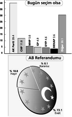 AK Parti tarafından Pollmark Araştırma'ya yaptırılan Ocak ayı gündem araştırması ilginç sonuçlar ortaya çıkardı. Anket bugün seçim olması halinde AK Parti'nin yüzde 39.4, CHP'nin 11.8, MHP'nin 5.6, GP'nin 4.9, DYP'nin 4.6 ve DEHAP'ın yüzde 3.6 oranında oy alacağını ortaya çıkardı. Kararsız olan veya hiçbir partiyi desteklemeyeceğini belirten seçmen oranı ise yüzde 25.3 oldu. Kararsızların oylarının dağıtılması halinde ise AK Parti yüzde 52.7, CHP 15.8, MHP 7.5, GP 6.6, DYP 6.2 ve DEHAP yüzde 4.8 oy alıyor.