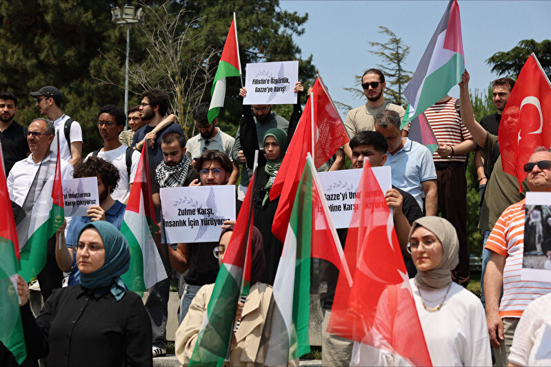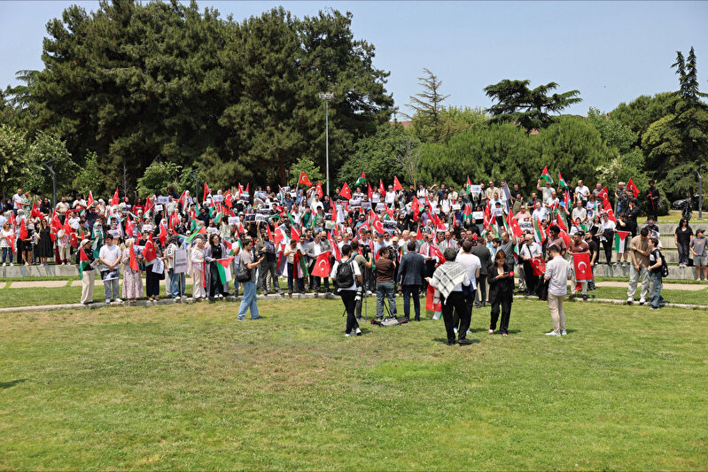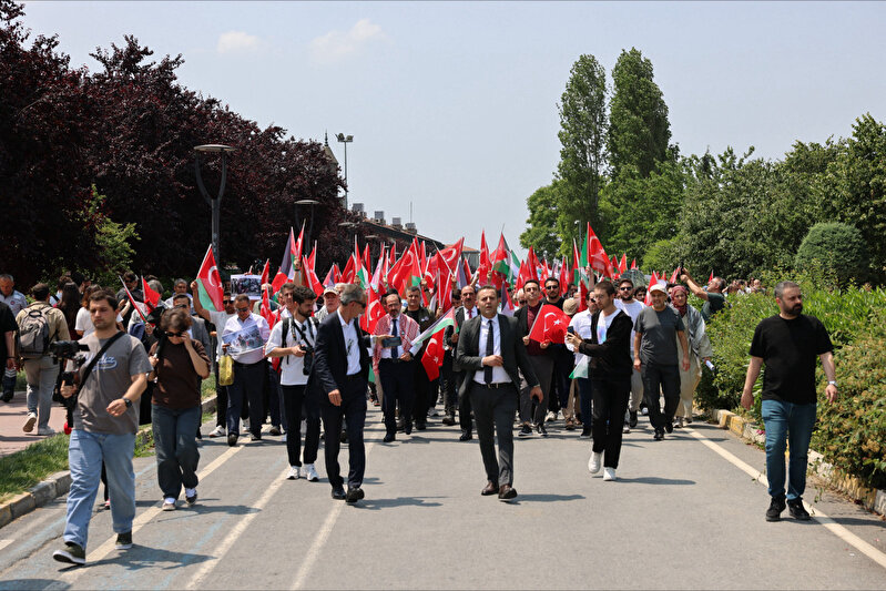 “Gazze İçin Adalet, İnsanlık İçin Ses Ver!” sloganıyla düzenlenen yürüyüşte, çok sayıda öğrenci ve öğretim üyesi Filistin halkıyla dayanışma mesajı verdi.