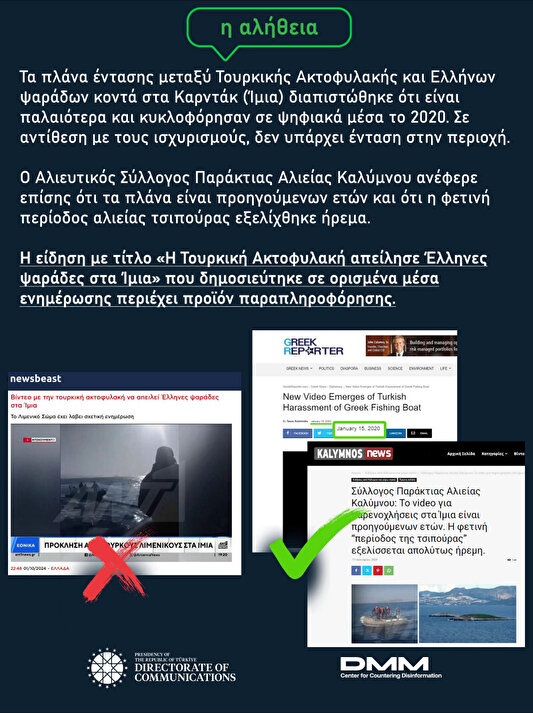 "Bazı basın yayın organlarında yer alan, 'Türk sahil güvenliği, Imia'daki Yunan balıkçıları tehdit etti' başlıklı haberler dezenformasyon içermektedir. Bahse konu olan Kardak (Imia) yakınlarında Türk Sahil Güvenliği ile Yunan balıkçılar arasında yaşanan gerginlik görüntülerinin güncel olmadığı ve 2020 yılında dijital mecralarda dolaşıma girdiği tespit edilmiştir. İddia edilenin aksine, bölgede herhangi bir gerilim söz konusu değildir. Kalimnos Kıyı Balıkçılığı Derneği de videonun önceki yıllara ait olduğunu ve bu yılki çipura avlama sezonunun sakin geçtiğini açıklamıştır.
