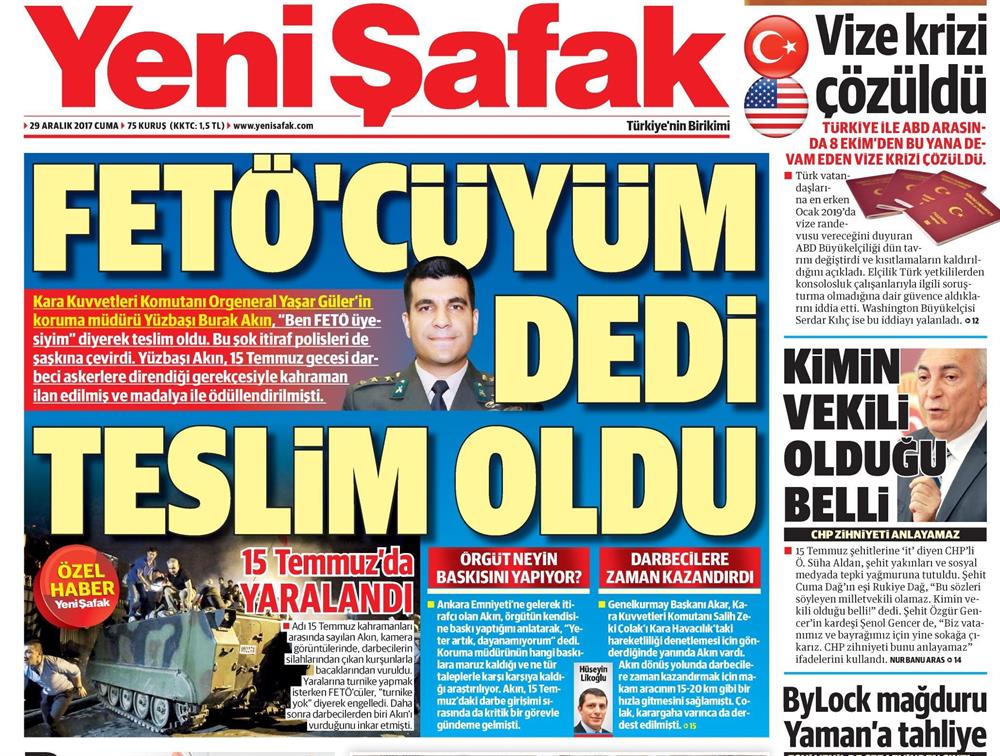 - Yeni Şafak'ın manşetiyle gündeme gelen olayda; Kara Kuvvetleri Komutanı Orgeneral Yaşar Güler’in koruma müdürü Yüzbaşı Burak Akın, “Ben FETÖ üyesiyim” diyerek teslim oldu. Bu şok itiraf polisleri de şaşkına çevirdi. Yüzbaşı Akın, 15 Temmuz gecesi darbeci askerlere direndiği gerekçesiyle kahraman ilan edilmiş ve madalya ile ödüllendirilmişti.