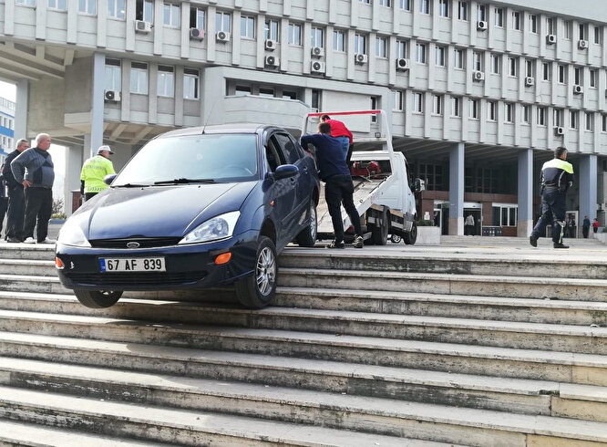 Zonguldak'ta valilik önüne öğle saatlerinde hareketli anlar yaşandı. Valilik önüne çıkan otomobil, yolu karıştırınca merdivende askıda kaldı.