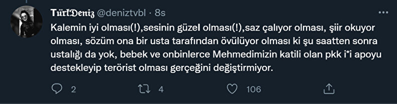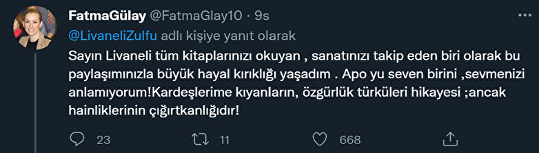 Livaneli paylaşımında "Edebiyatımızın usta kalemlerinden Selahattin Demirtaş’ın son romanını zevkle okuyorum. Teşekkürlerimle. Zor koşullarda, uzun sürelerde verdiği, insancıllık ortak temalı, 4 eserini de okumanızı öneriyorum. Giderek gelişen bir dil ve derinleşen konular." ifadelerini kullandı.