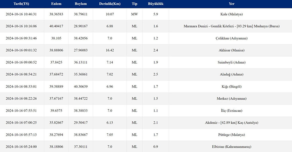 16 Ekim 2024 son dakika AFAD son depremler ve Kandilli son dakika deprem listesi..